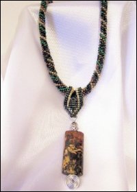 Tubular peyote-stitch rope, consisting of shades of green, black, bronze, and silver delica beads in regular spirals, 18 inches long, with heart-shaped toggle clasp. Green, black and silver square-stitch open slide carries a dark green opalescent stone in shades of green, brown, and tan, dangling from a wire and bead bail finished with a spiral. Slide can be removed and the rope worn alone. Matching bracelet-length rope is also available. Price: $30.00 Please contact us if you are interested in this necklace.